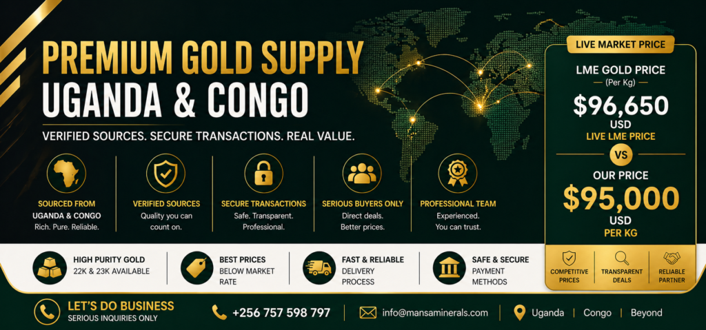Mansa minerals is a Ugandan group of company focused exclusively on gold business for retail and wholesale customers. We offer dealing in nuggets Minted Bars and Cast Bars with worldwide delivery. Our flagship offering is full-service custody of gold in Uganda , Congo, Madagascar.
